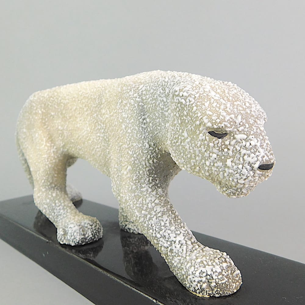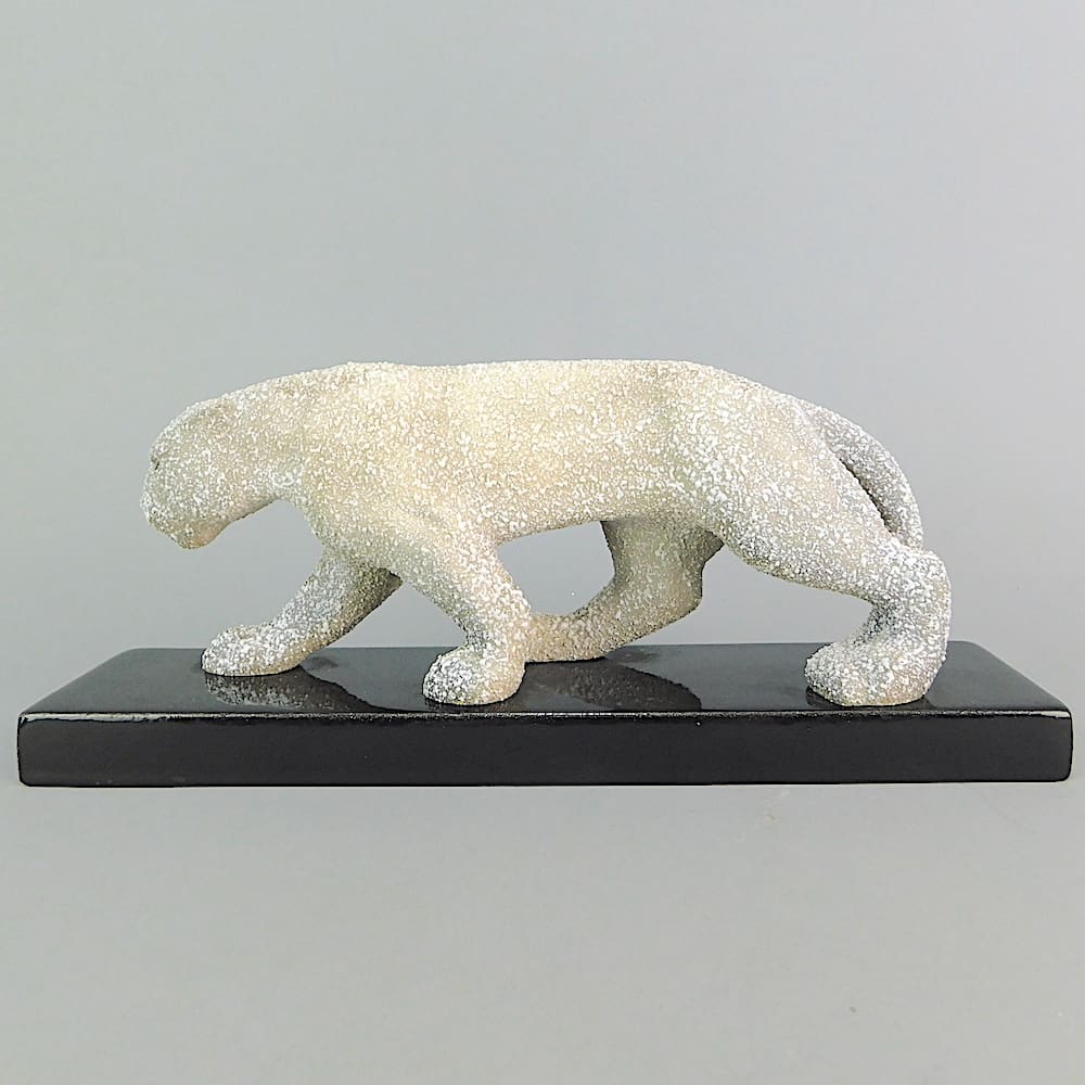 An Odyv French ceramic panther decorated with the typical wax glaze technique known as ‘crispe’ by the French and mounted on a gloss ceramic base.
