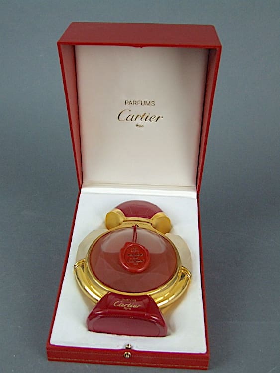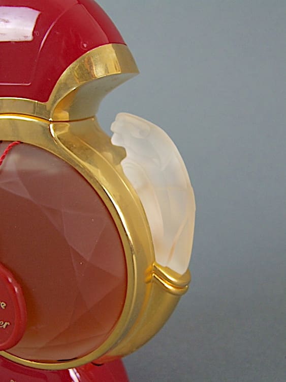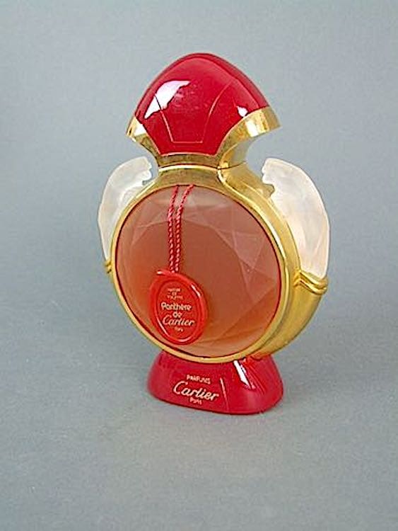 This French scent bottle has glass panthers on either side of it. It was made in a limited amount by Cartier in the mid 1980s in a deco style. This is the largest bottle they made being 200ml and it still retains its original perfume, box, tag and paperwork. It is called Perfume Toilette Panther de Cartier.