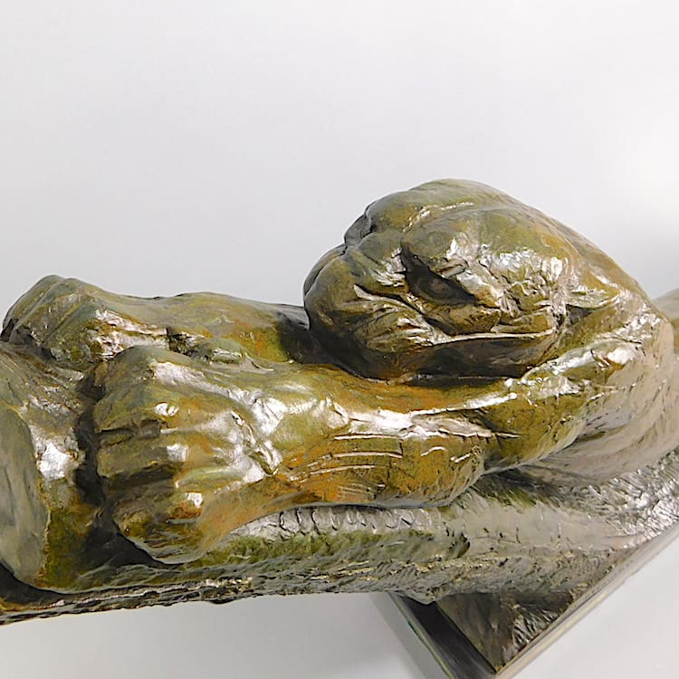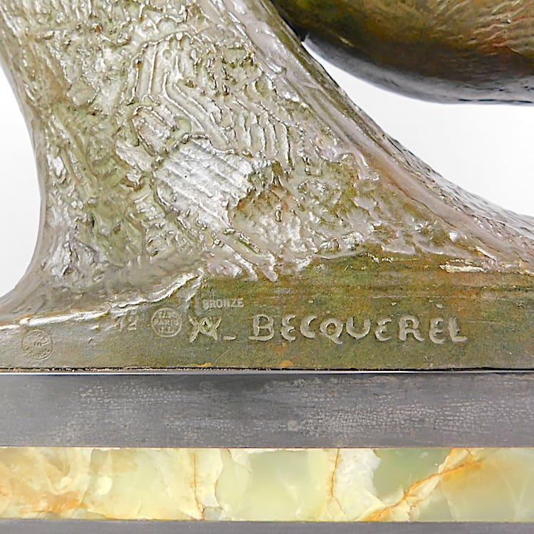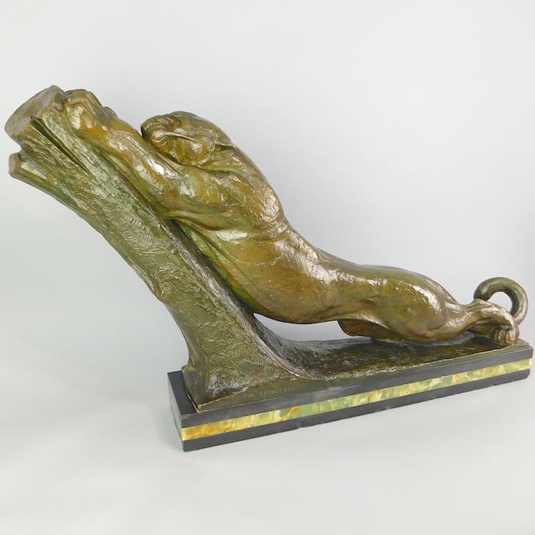 Large French Art Deco bronze stretching panther by André-Vincent Becquerel (1893-1981). Dark green patinated bronze, signed to the bronze, with numerals 12 and a foundry mark for Neveu Lehmann (Paris). Mounted on a black marble and Brazilian onyx base.