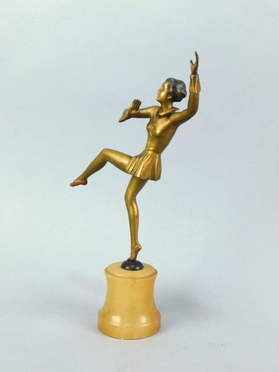 An original 1930s cold painted gilt enamel art deco dancer in a theatrical costume, mounted on an alabaster flared base.