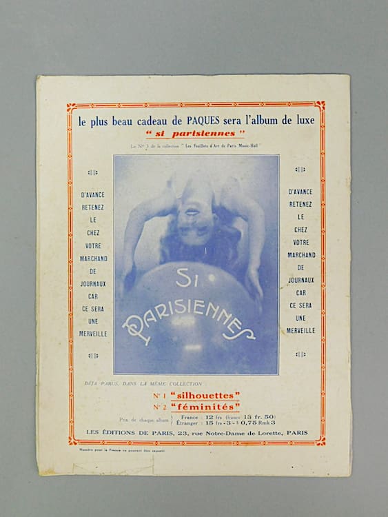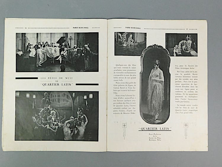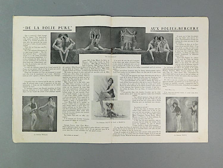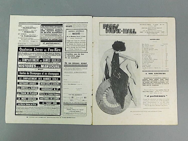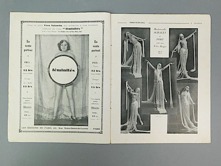 French semi erotic Paris Music Hall magazine dating 15th March 1929 (Issue 185). The cover is in sepia and insides in black and white. Mainly featuring nudes and semi nudes and costumed female dancers from the Follies Berger. Probably very saucy in their day. An amazing glimpse back in time, featuring many stunning poses and costumes which one sees in the art deco statues of the period. Cover photo by Walery.