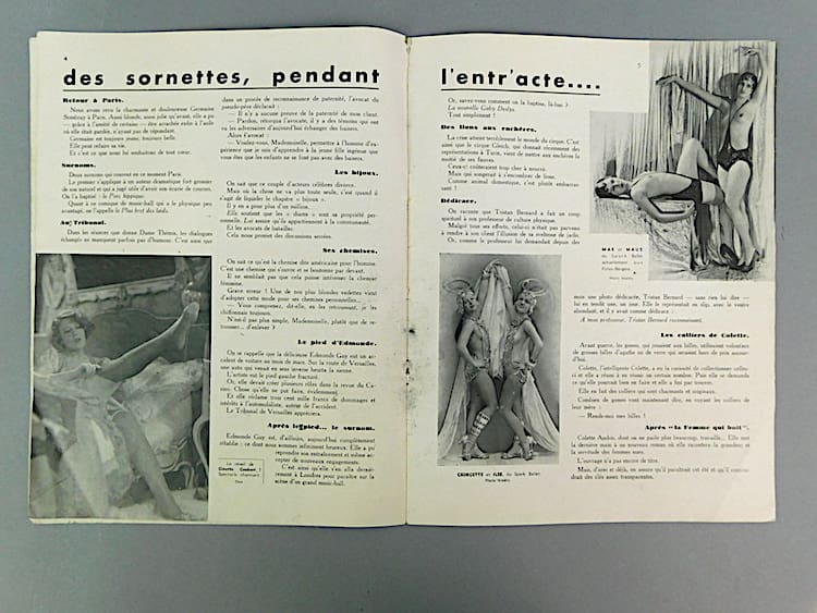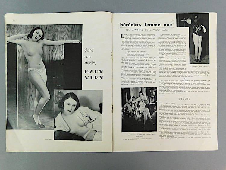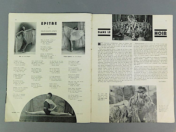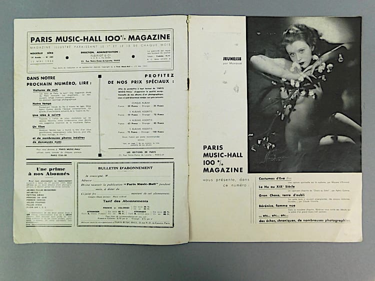 French semi erotic Paris Music Hall magazine dating 15th May 1933 (Issue 285). The cover is in sepia and insides in black and white. Mainly featuring nudes and semi nudes and costumed female dancers from the Follies Berger. Probably very saucy in their day. An amazing glimpse back in time, featuring many stunning poses and costumes which one sees in the art deco statues of the period.
