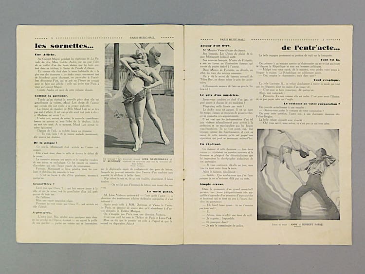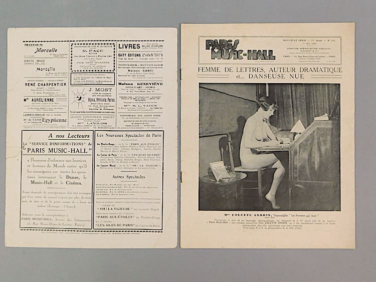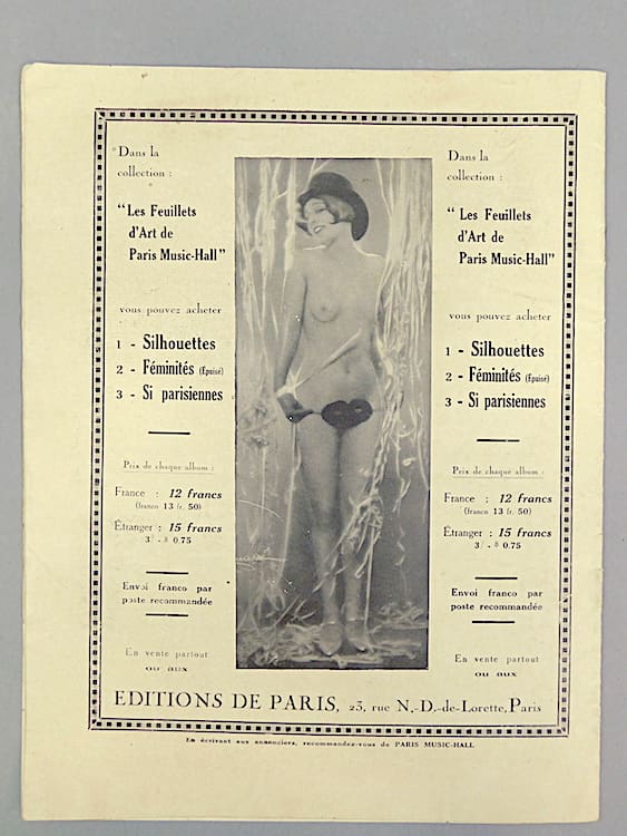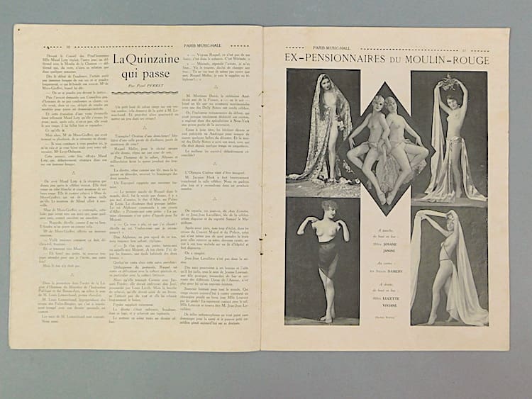 French semi erotic Paris Music Hall magazines dating 15th December 1927 (Issue 155). the cover is in sepia and insides in black and white. Mainly featuring nudes and semi nudes and costumed female dancers from the Follies Berger. Probably very saucy in their day. An amazing glimpse back in time, featuring many stunning poses and costumes which one sees in the art deco statues of the period. Cover picture by Walery.