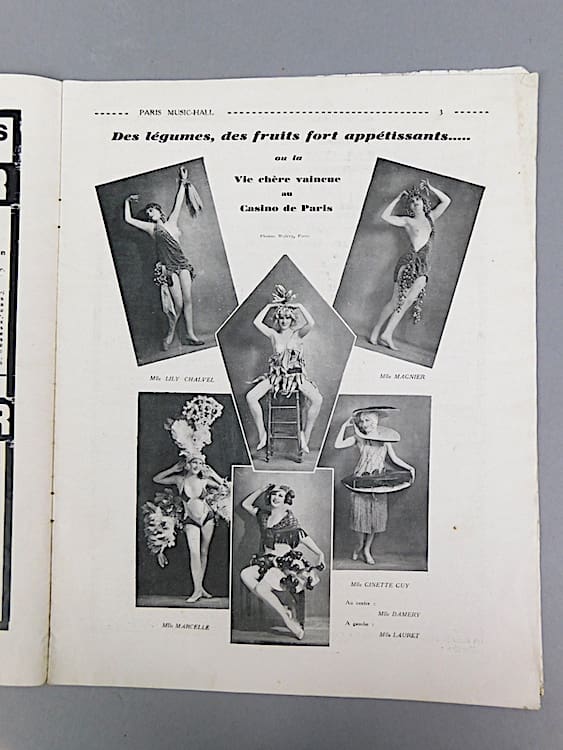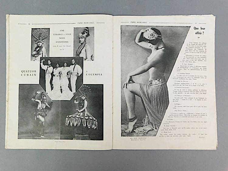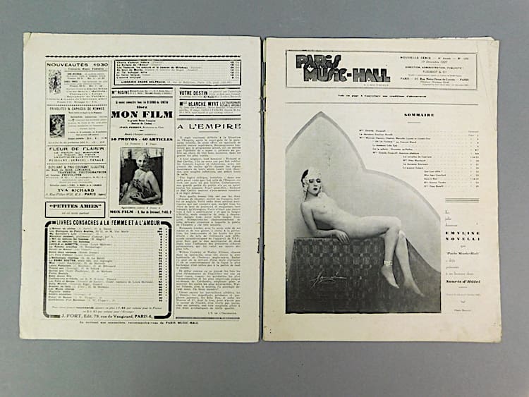 French semi erotic Paris Music Hall magazine dating 1st May 1930 (Issue 212). The cover is in sepia and insides in black and white. Mainly featuring nudes and semi nudes and costumed female dancers from the Follies Berger. Probably very saucy in their day. An amazing glimpse back in time, featuring many stunning poses and costumes which one sees in the art deco statues of the period. Cover photo of J. Mandel.