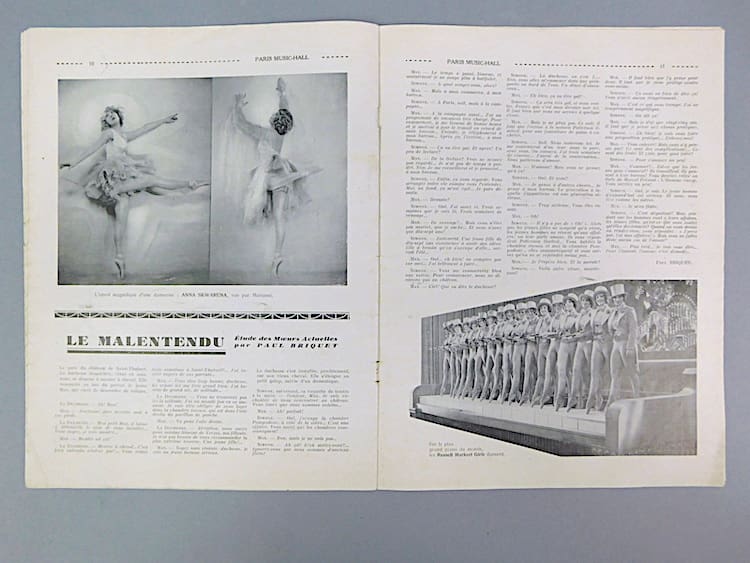 French semi erotic Paris Music Hall magazine dating 15 May 1930 (issue 213). The cover is in sepia and insides in black and white. Mainly featuring nudes and semi nudes and costumed female dancers from the Follies Berger. Probably very saucy in their day. An amazing glimpse back in time, featuring many stunning poses and costumes which one sees in the art deco statues of the period. Cover photo by Walery.