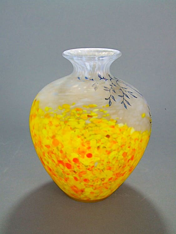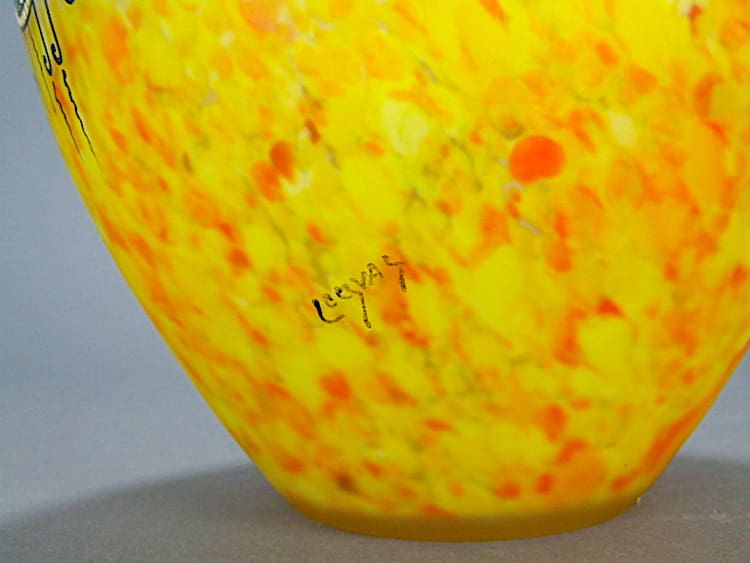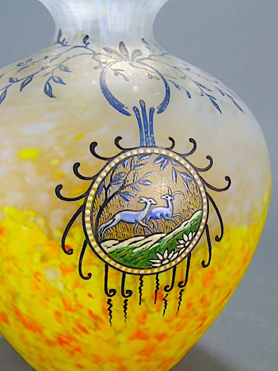 Large baluster base, made of pate de vere glass. To the front panel is a cabochon with 2 deer in a landscape. It is signed Legras.