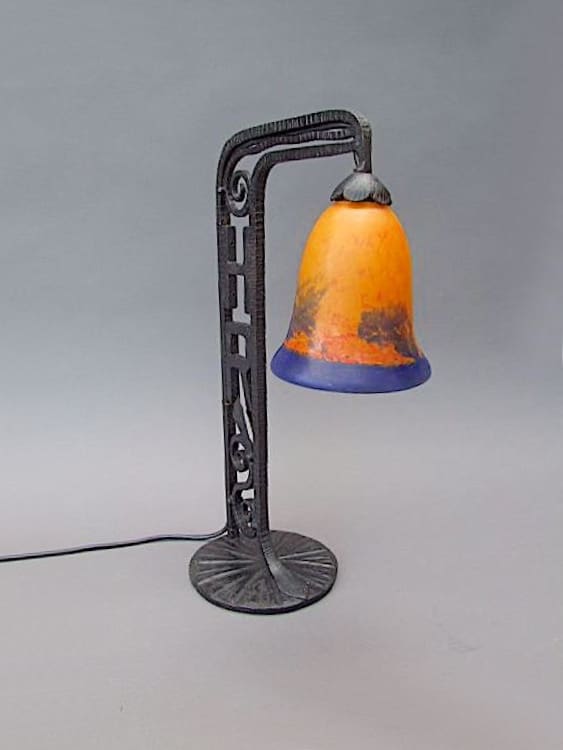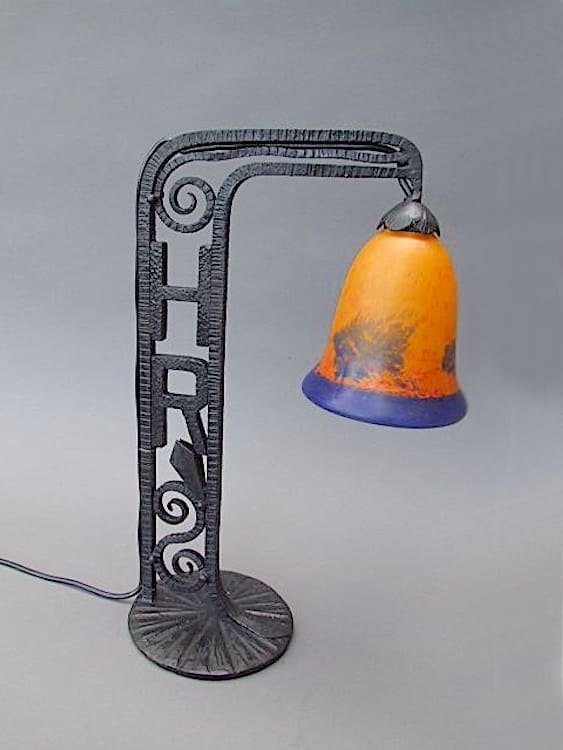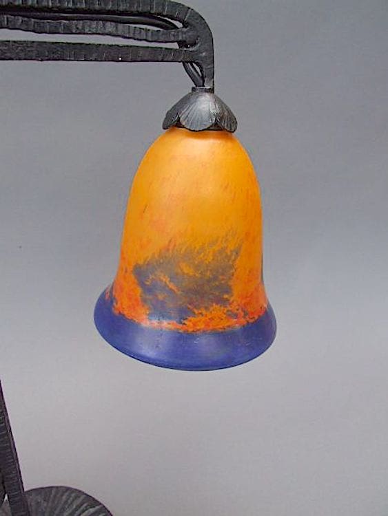 French wrought iron table lamp, which originally came from a shop counter – hence the HR initials to the stem. Orange and blue quality pate de verre shade that looks stunning when lit.