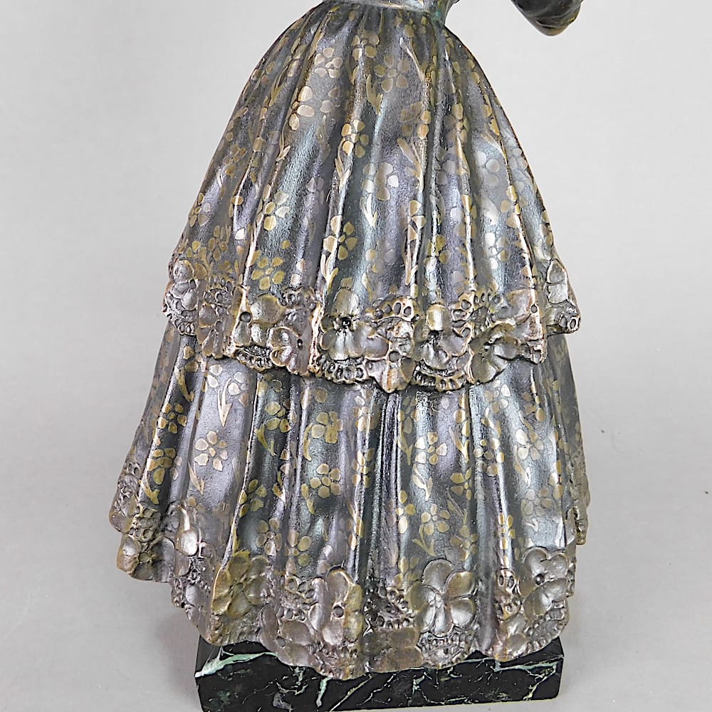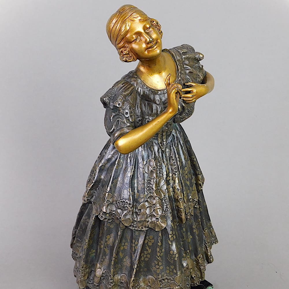 A French gilt bronze figure of exceptional quality, modelled as a pretty lady in an elaborately decorated dress with painted enamel flowers and lace.