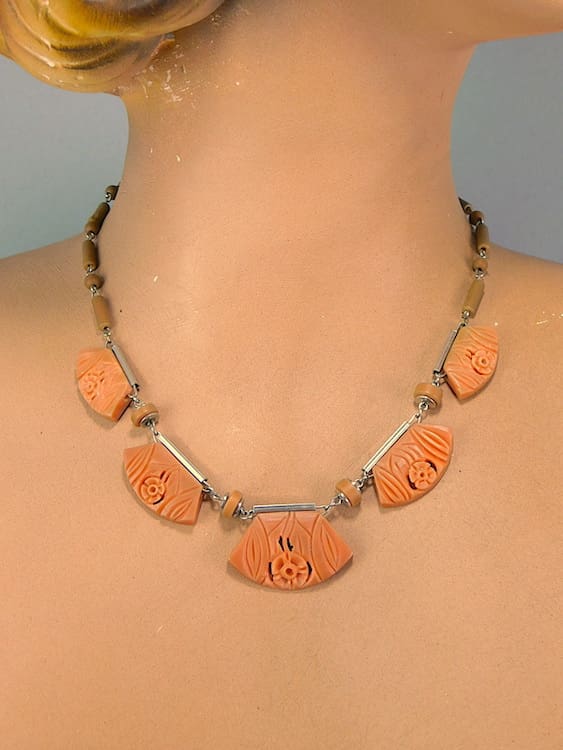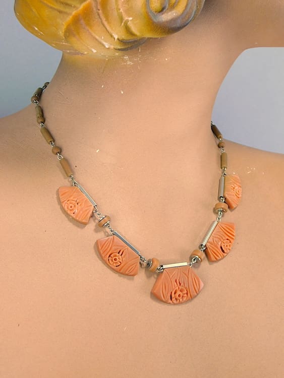 1920’s peach galalith panels with floral carving and brown beads.