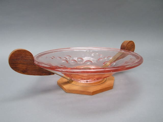 A French pink glass fruit bowl with bronze or brass mounts and carved wood handles. Glass has moulded cherry detail.