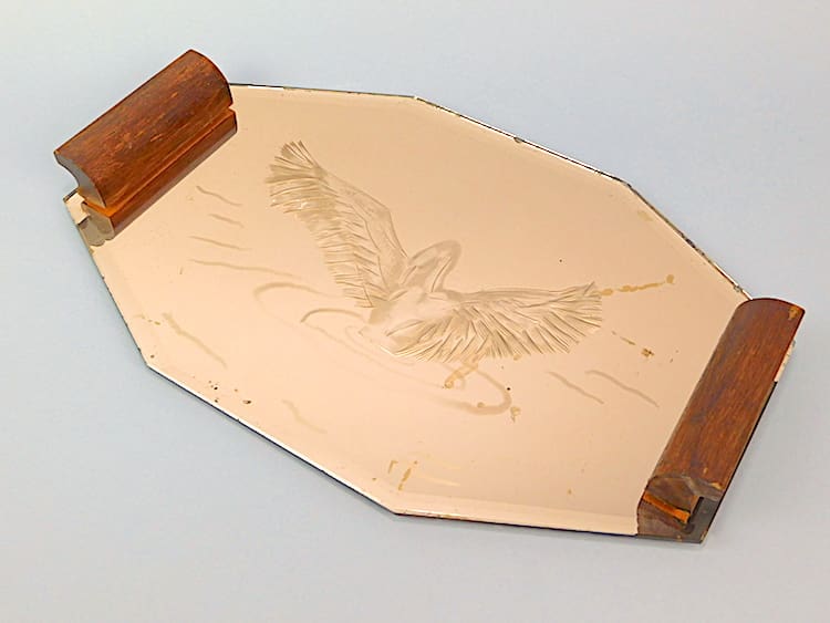 A peach glass tray with a swan etching to the centre and with wooden handles.