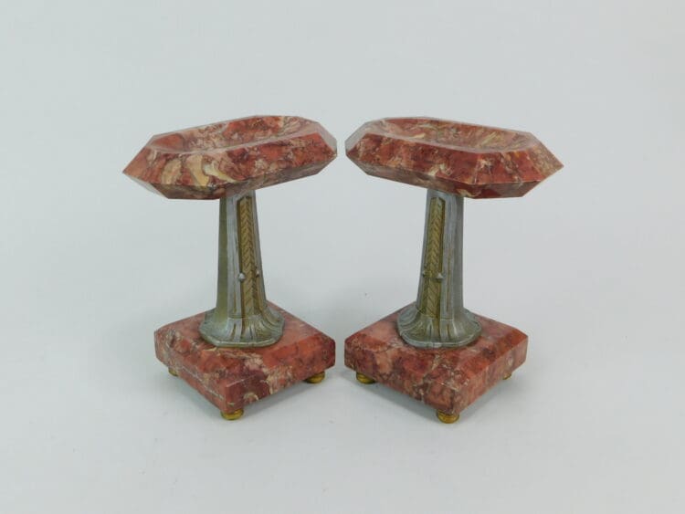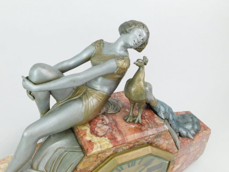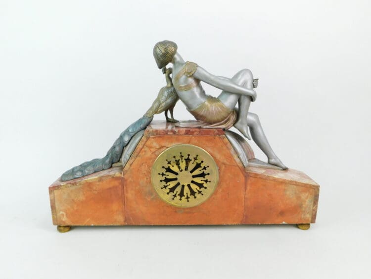 French spelter and rosso marble clock with matching pedestal side pieces.