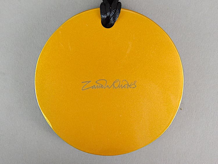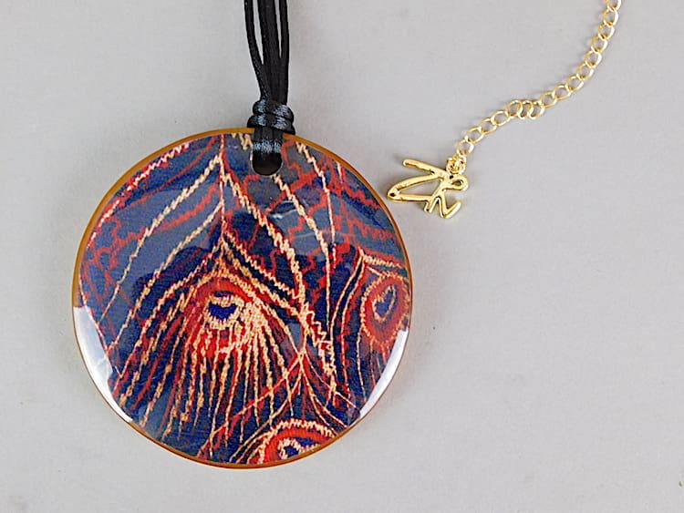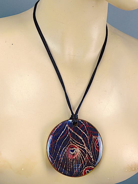 Vintage ZR peacock phenolic pendant necklace on a black cord – no longer in production. The pendant section shows pack feathers and is signed to the back. Comes with its original pink ZR pouch.