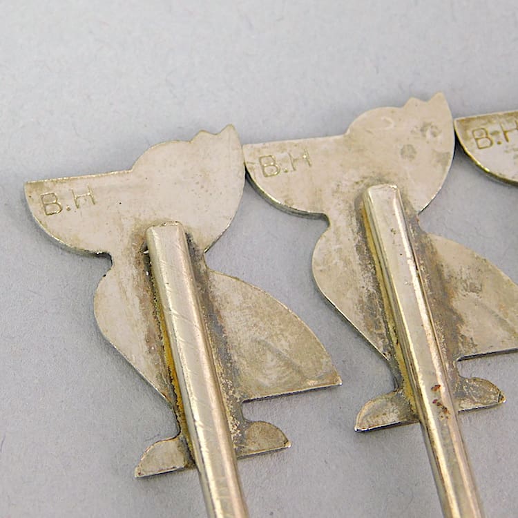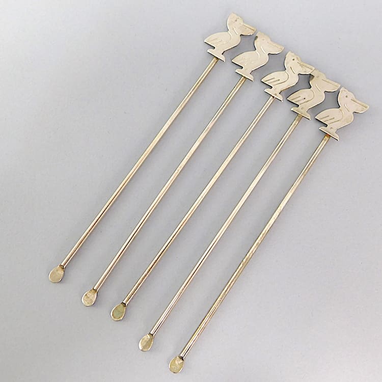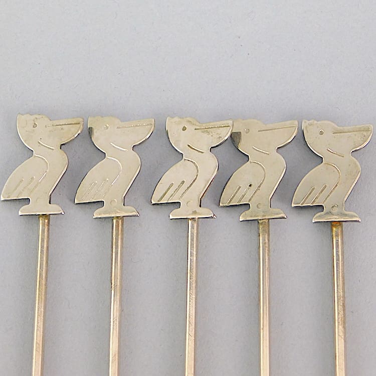 French art deco stylised Pelican swizzle sticks. Designed by Benjamin Rabier. There are 5 sticks and each is initialled BH to the back.