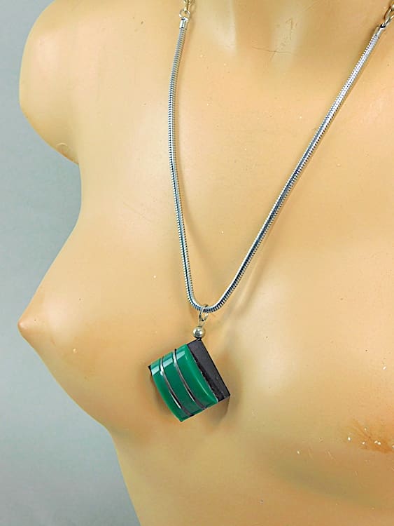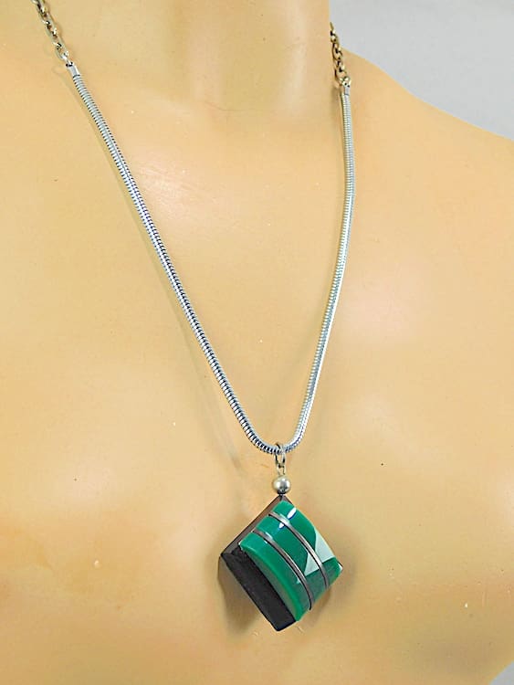 Green and black galalith pendant section on a snake chain. Made in the early 1930’s by Jakob Bengel.