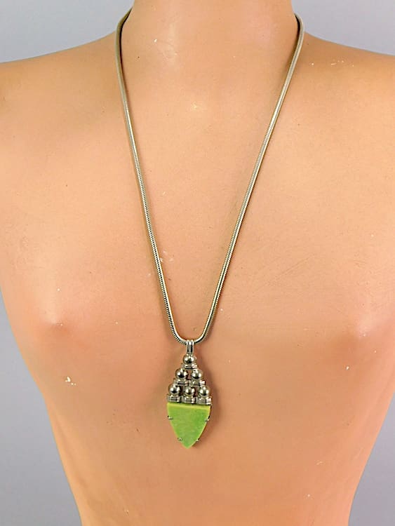 Green galalith pendant necklace on a snake chain, made by Jakob Bengel in the early 1930’s.