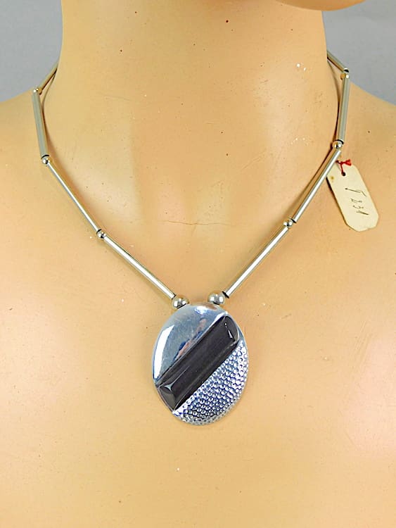 Chrome and black galalith necklace from the Bengel factory, made in the 1930’s and fitted with a screw clasp. Still bears its model number tag from the foundry.