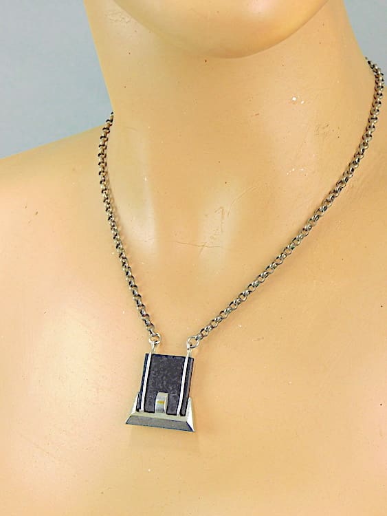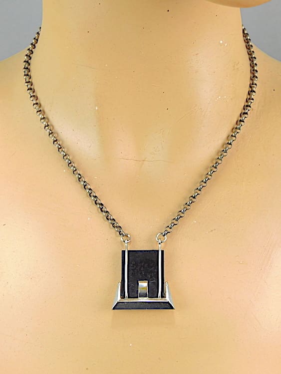 Wonderful black galalith necklace with central pendant detail, by Jakob Bengel.