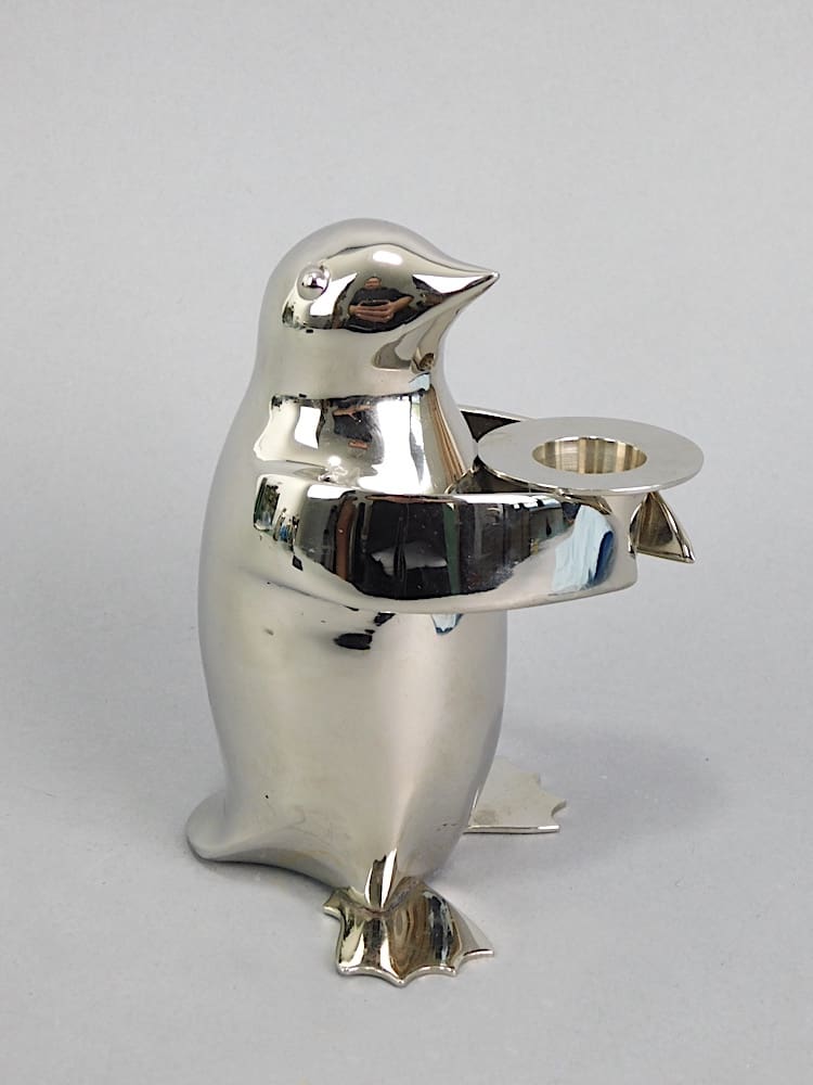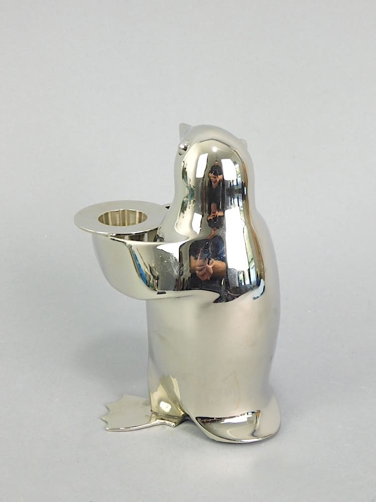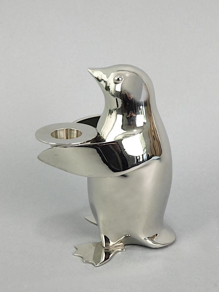 Stylised chrome plated Penguin candle stick holder. He is holding a top hat for the candle.