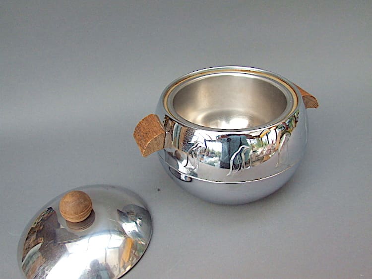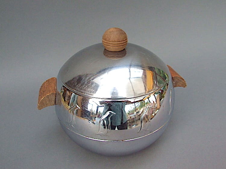 American ice or heat bucket, made by West Bend Aluminium Co. It has wooden handles and knob.