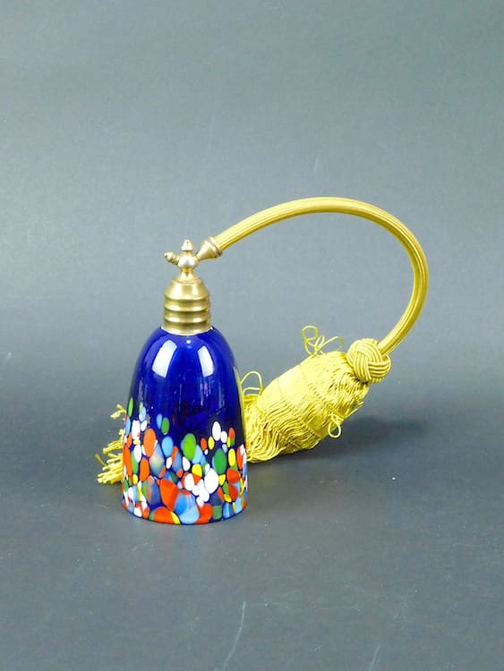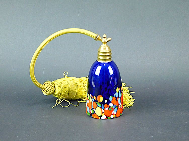 Czech art glass, end of the day, perfume atomiser. Navy blue glass bottle with metal top.