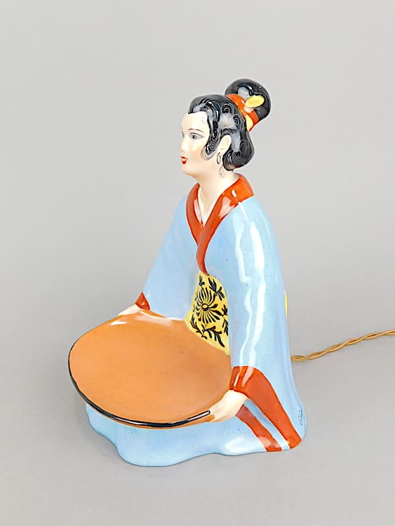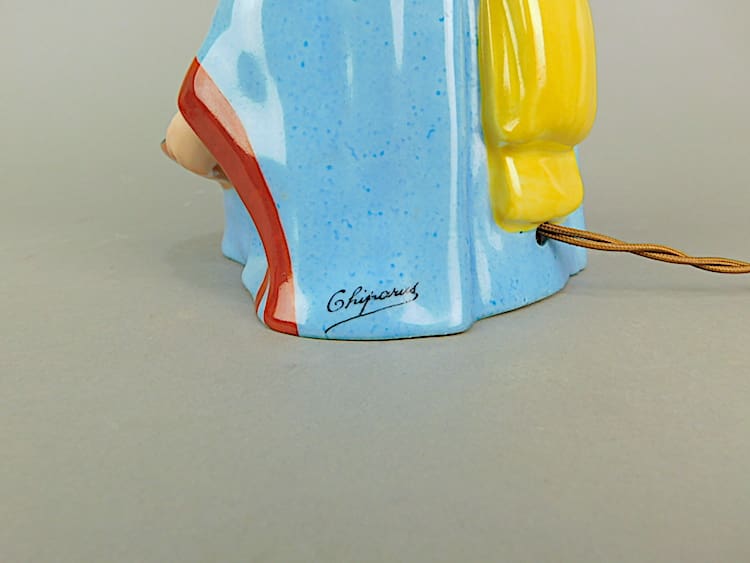 French ceramic art deco Chinese lady perfume lamp, a signed piece by Demetre Chiparus. Produced by the Etling foundry and stamped to the base. She is wired and has a bulb.