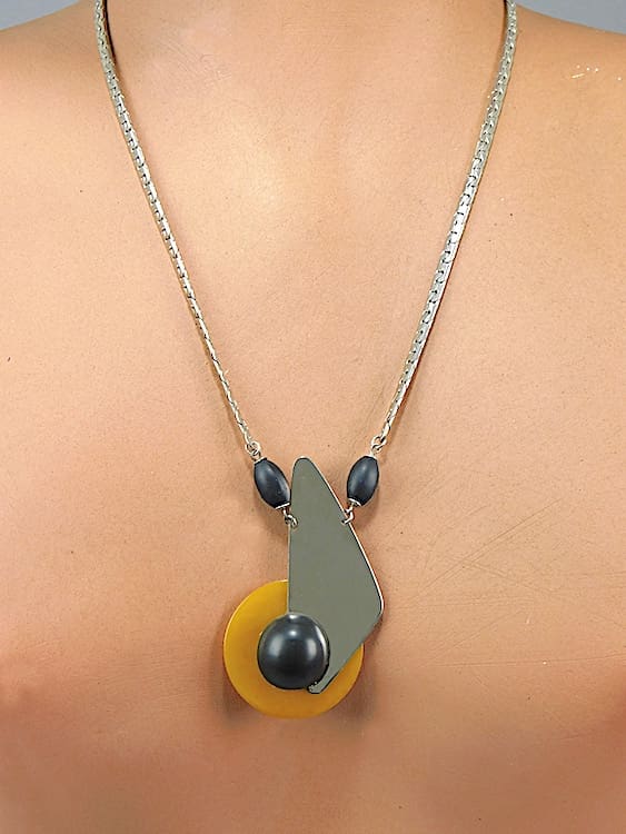 Chrome plate with intricate chrome chain, black and yellow galalith 1930’s necklace. Made in Germany.
