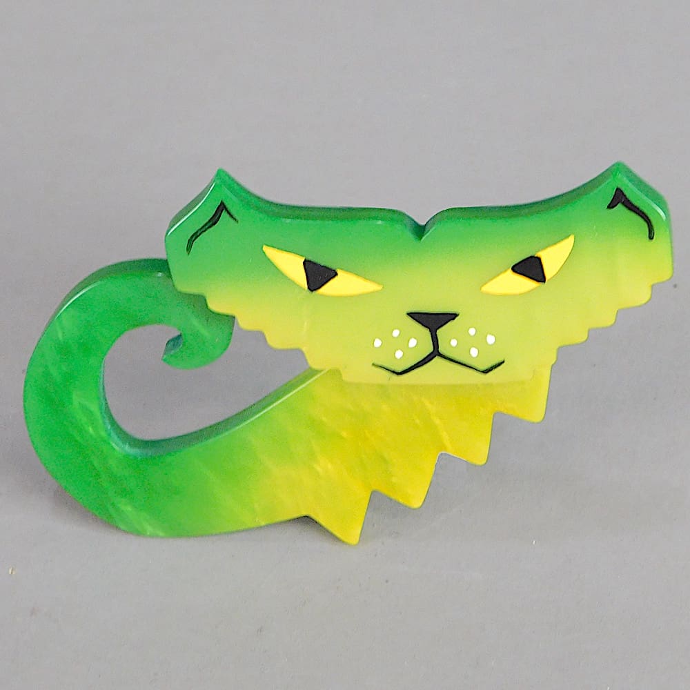 Vintage green bakelite cat brooch by Marie-Christine Pavone. Hand painted and signed by Pavone herself and fitted with a roll safety clasp.