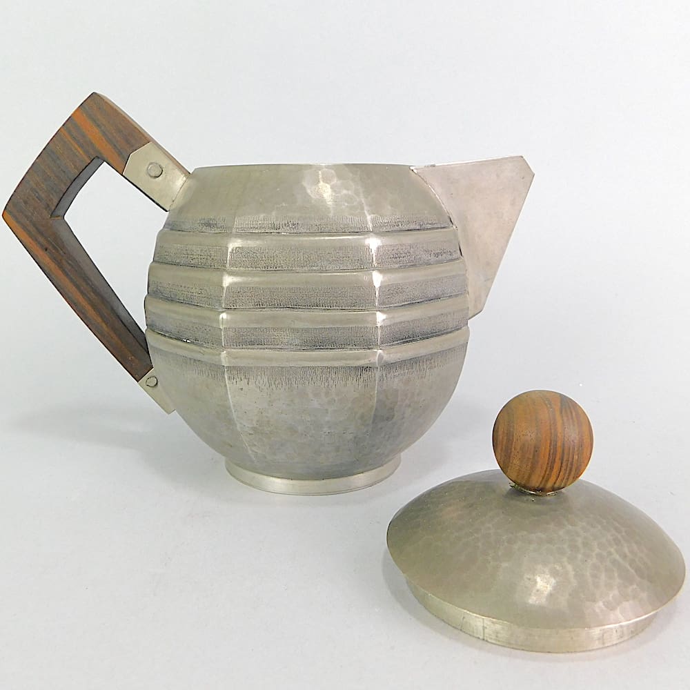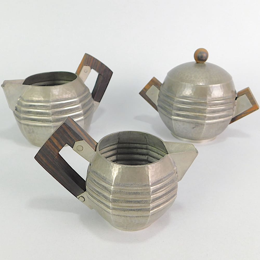 French 6-piece tea/coffee set made of tapped pewter in beehive shape with central ribbing and macassar handles. The set consists of tea and coffee pots, milk jugs large and small and a lidded sugar bowl. Each piece is monogramed to the side and stamped under the base – Etain Moderne with the signature J. Maniole.