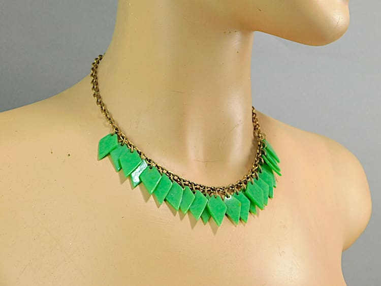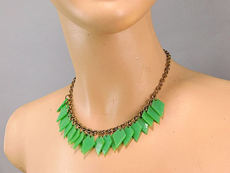 Green phenolic modernist American stylised leaf necklace on a gilt chain.