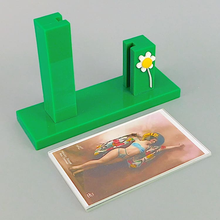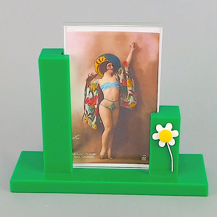 Green asymmetric phenolic photo frame with a daisy to one side.