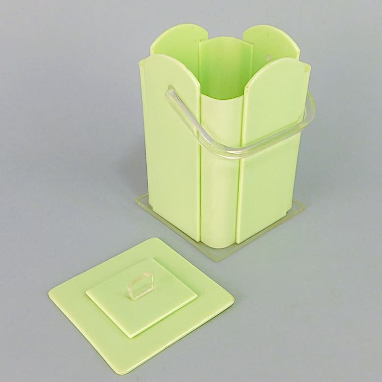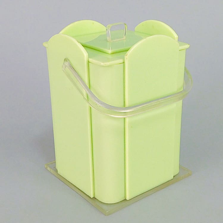 Lime green phenolic Art Deco biscuit box with green lid and clear base and handle.