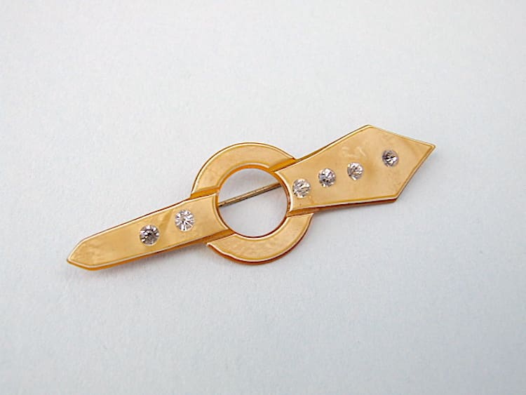 American pearlised golden phenolic tie design brooch with large diamonte stones.