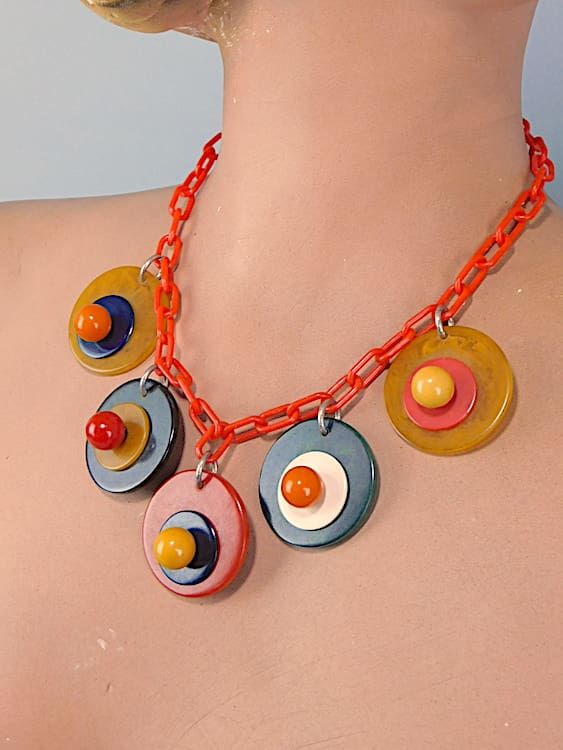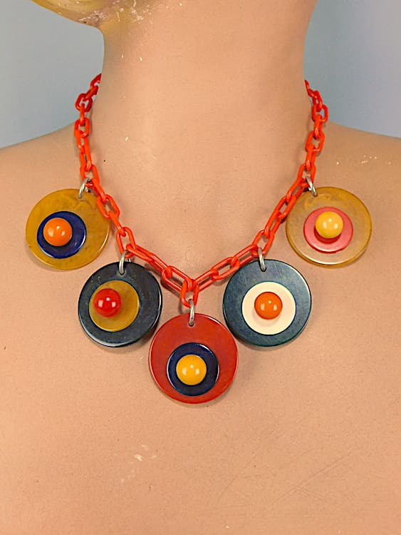 Fabulous gaming chip necklace, probably a souvenir from a casino. Marked to the back of each panel The Lieblings so possibly German or American.