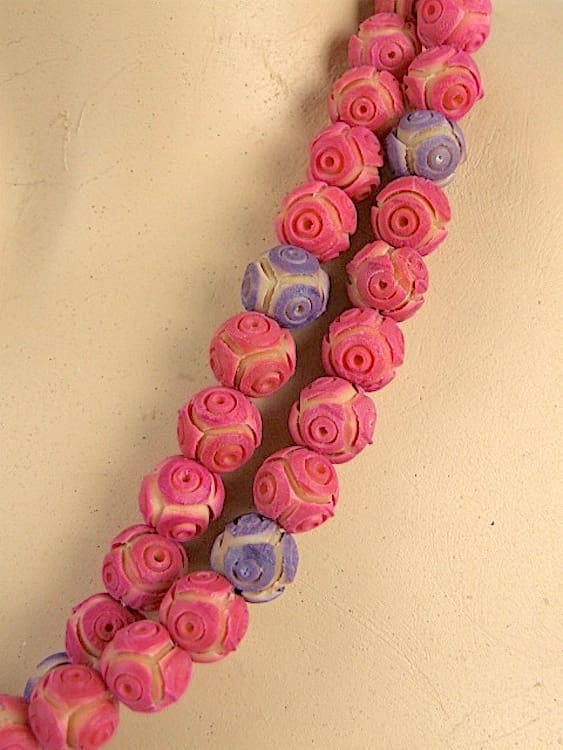 Vivid pink and purple phenolic flapper beads. So can be worn either once or twice around the neck.