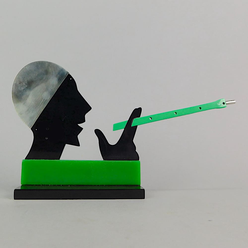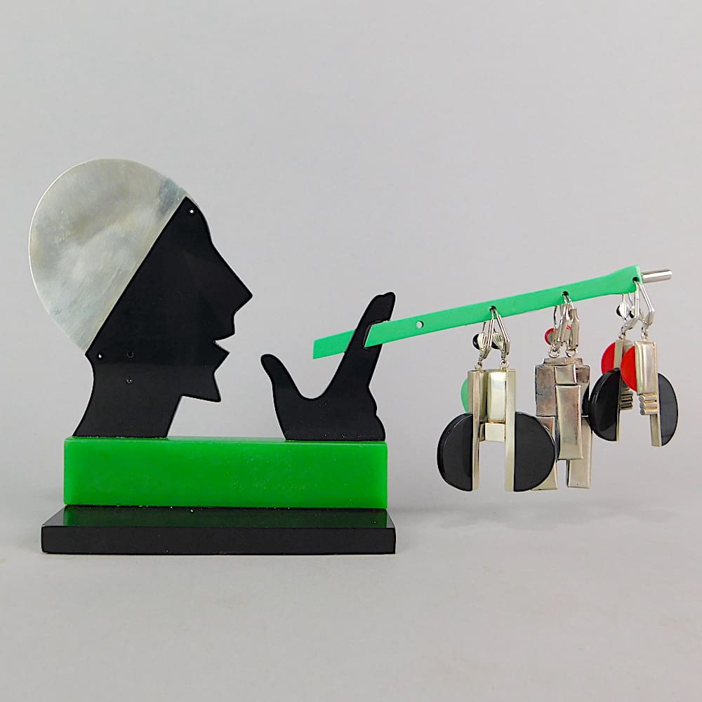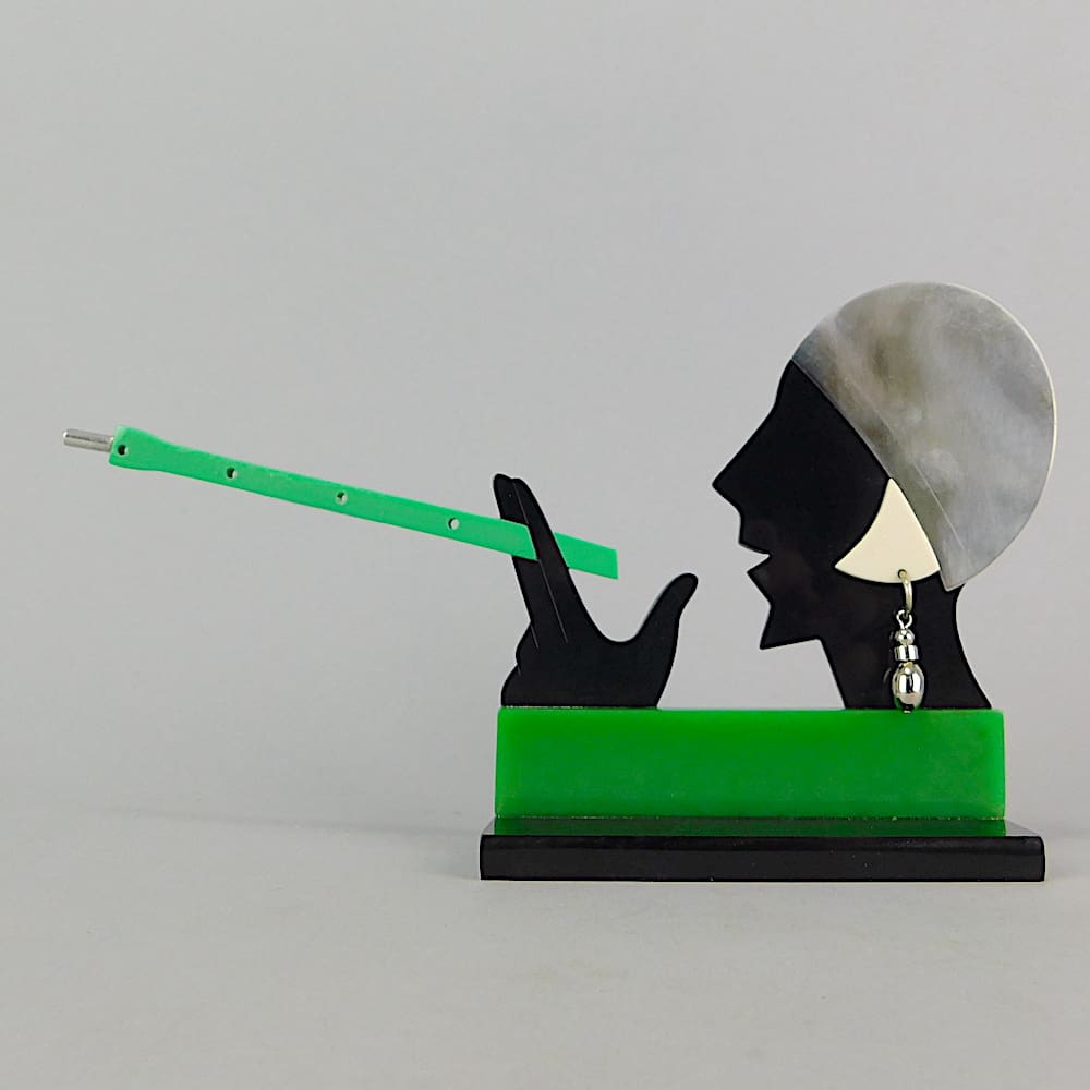 French chromed metal and phenolic ear rings stand of a smoking flapper lady.