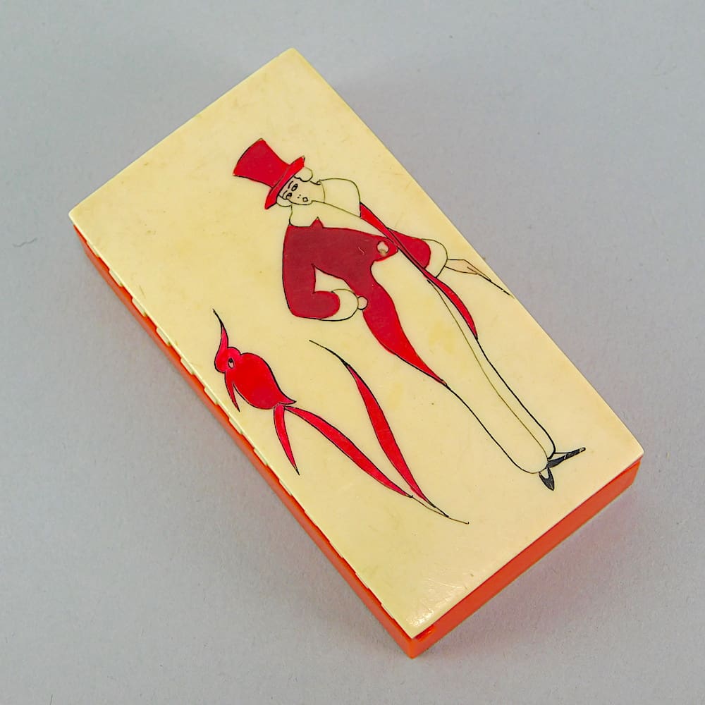 Empty sewing kit box with a flapper in topcoat and tails with a cane to the lid.