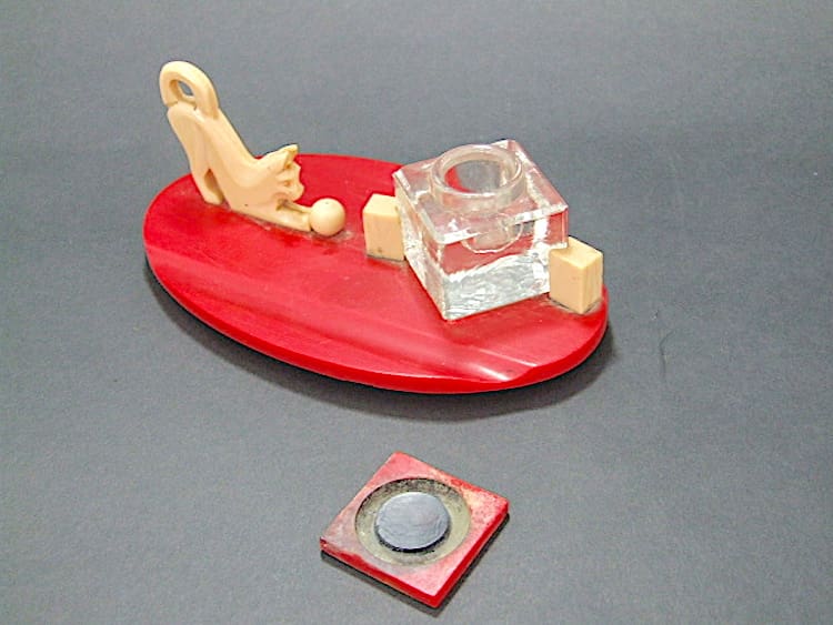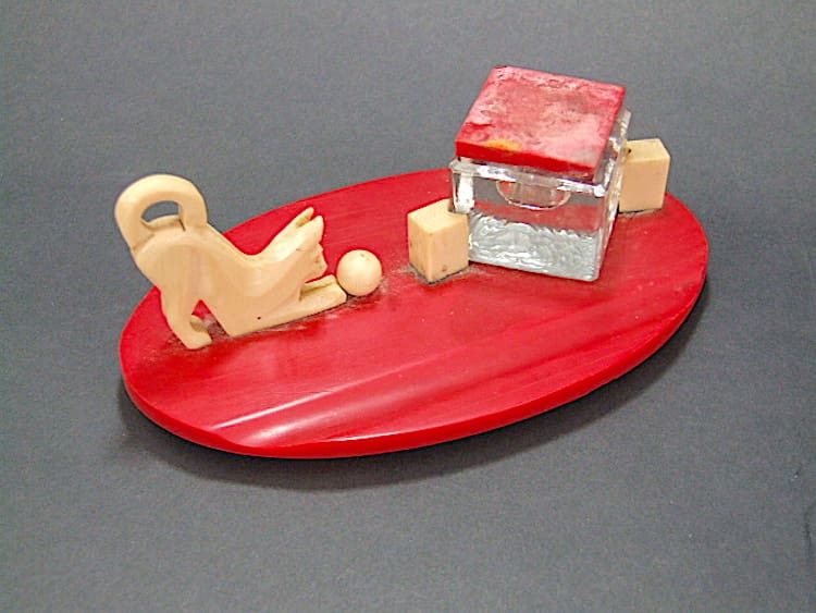 French cat and ball phenolic desk ink pot. Glass ink pot, red phenolic base and cat and ball with a ridge to the front as a pen rest.