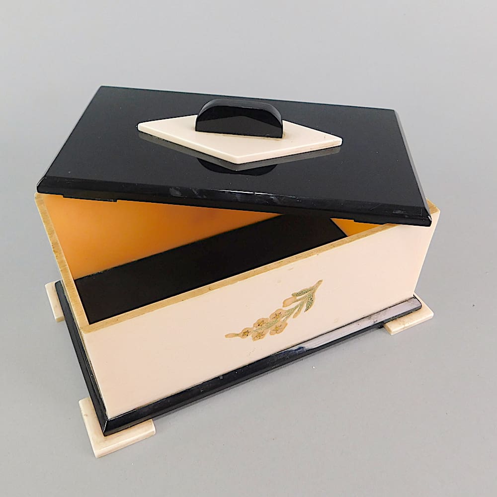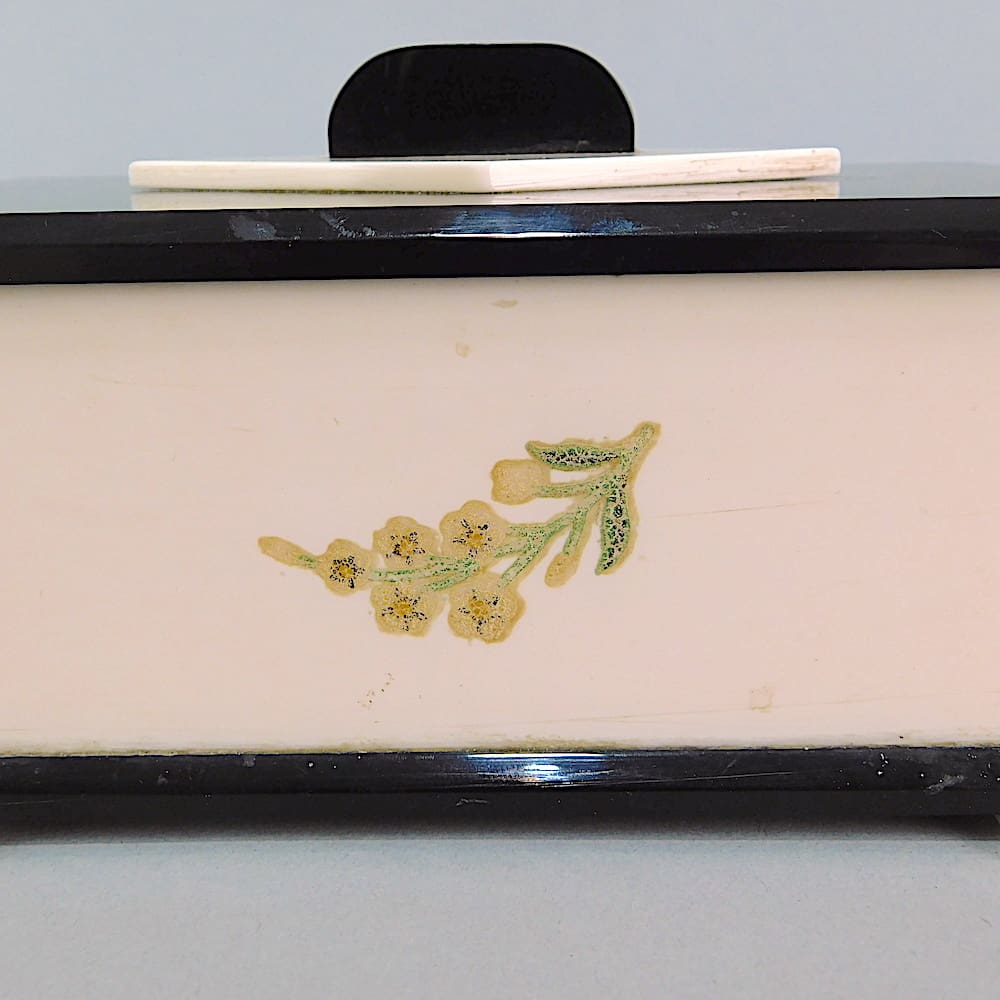 English pink and black phenolic box with floral transfer detail.