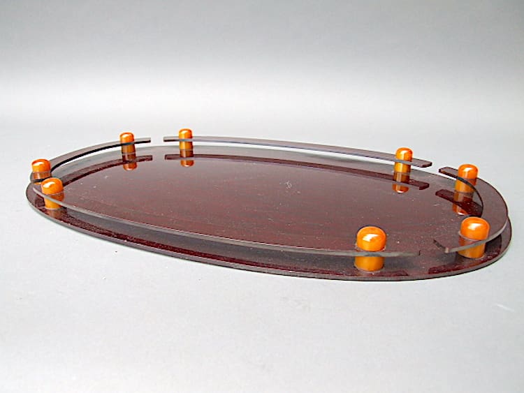 Wonderful modernist phenolic tray in dark red-brown with amber knob detailing.