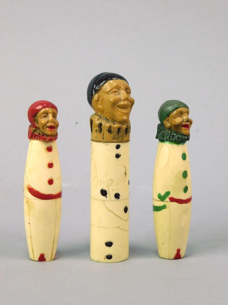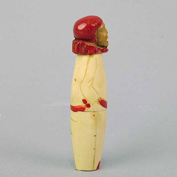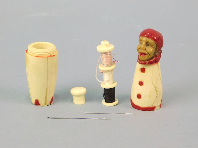 A single bakelite clown container with cotton reel inside and made in Belgium by the Ebena company.