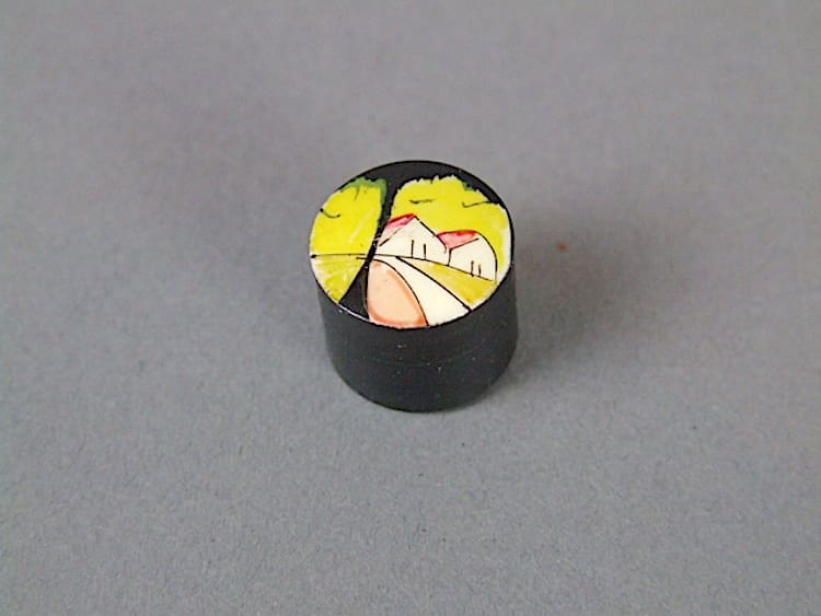 Small phenolic handbag scent box with house and tree design to the lid. Originally would have held block scent.