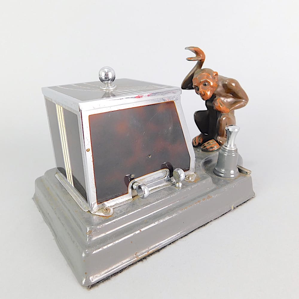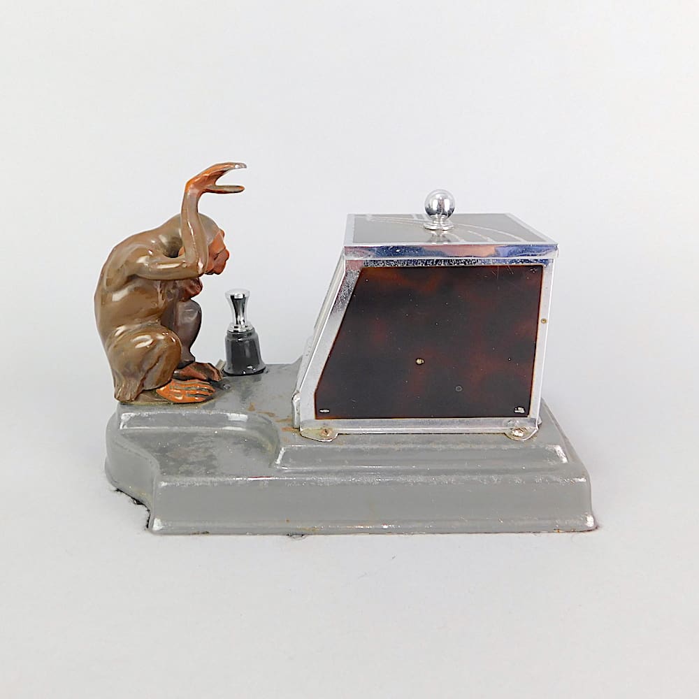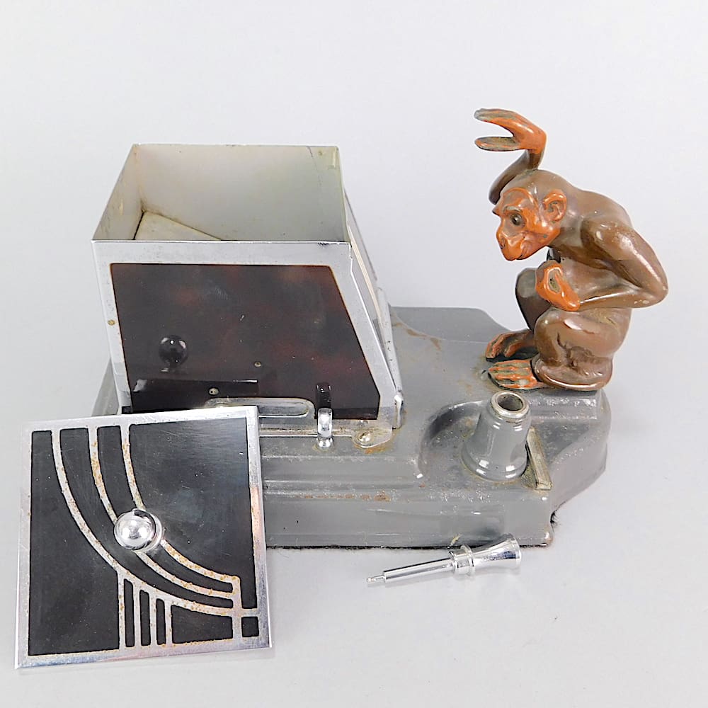Wonderful Strike-Lite monkey cigarette box and lighter with chrome knob, enamelled geometric patterning and grey metal base. Made by Ronson circa 1934. The base usually contains the Ronson stamp but this one has lost its base over the years and has been replaced with card covered in felt. I also have the penguin box. Squeeze the lever to the front and the monkey will pick up a cigarette from the drawer for you.