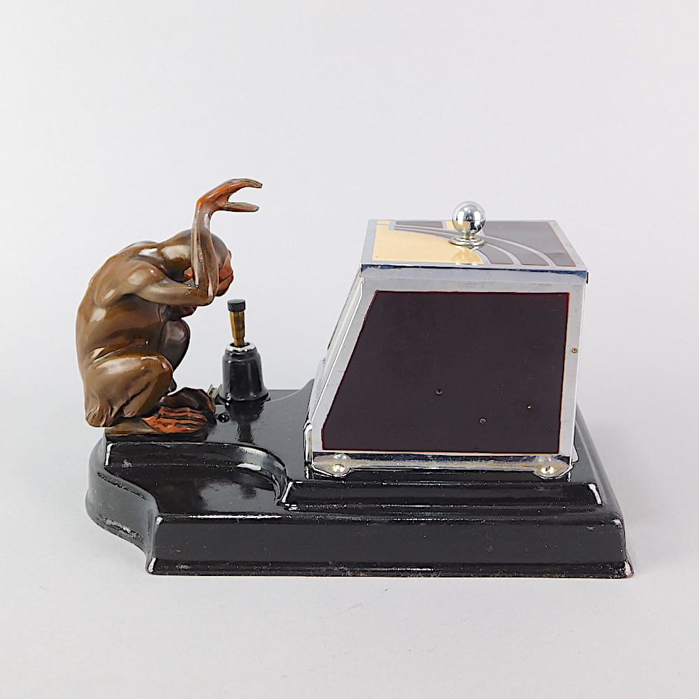 Wonderful Strike-Lite monkey cigarette box and lighter with chrome knob, enamelled geometric patterning and black metal base. Made by Ronson circa 1934 it bears the Ronson stamp under the base. I also have the penguin box. Squeeze the lever to the front and the monkey will pick up a cigarette from the drawer for you.