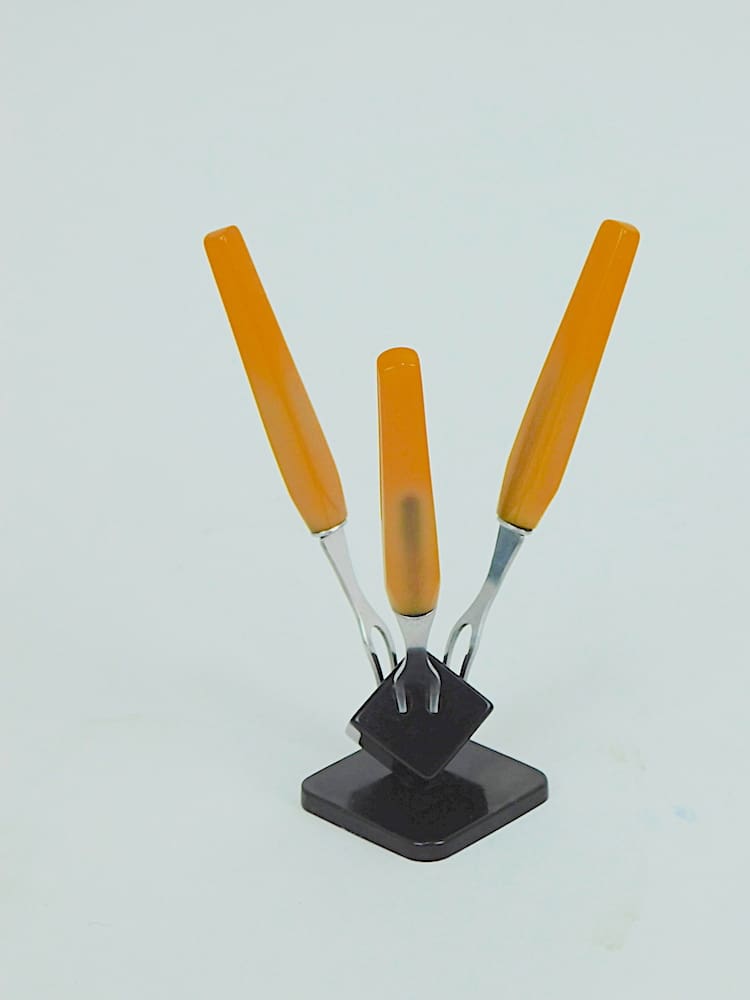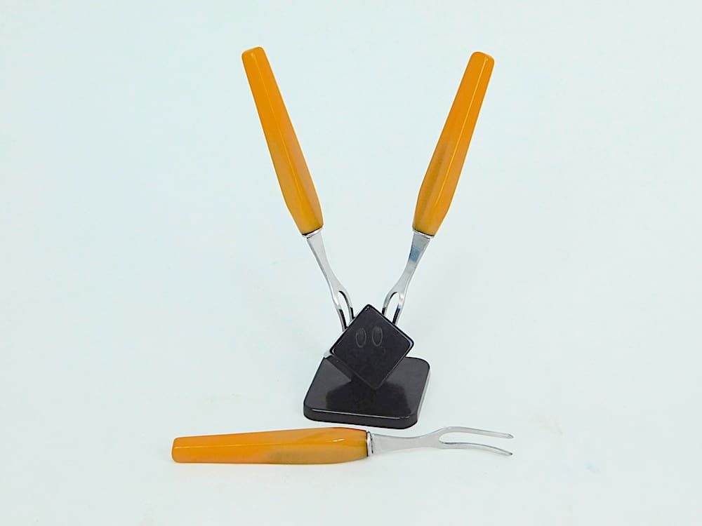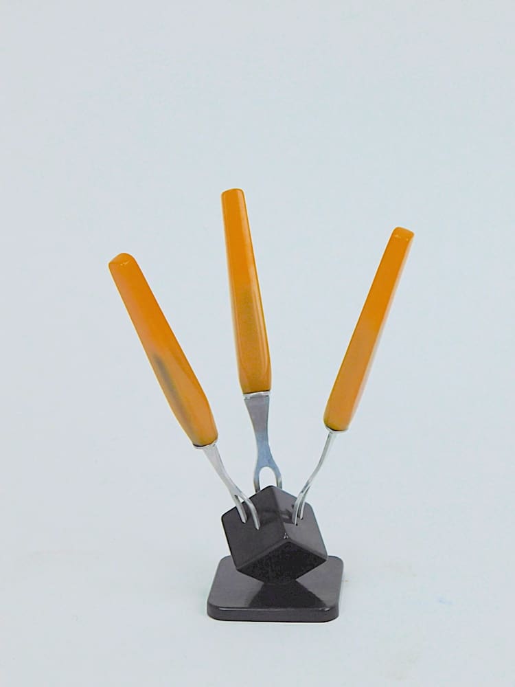 Set of three German galalith pickle or olive forks which slot into a dice base.
