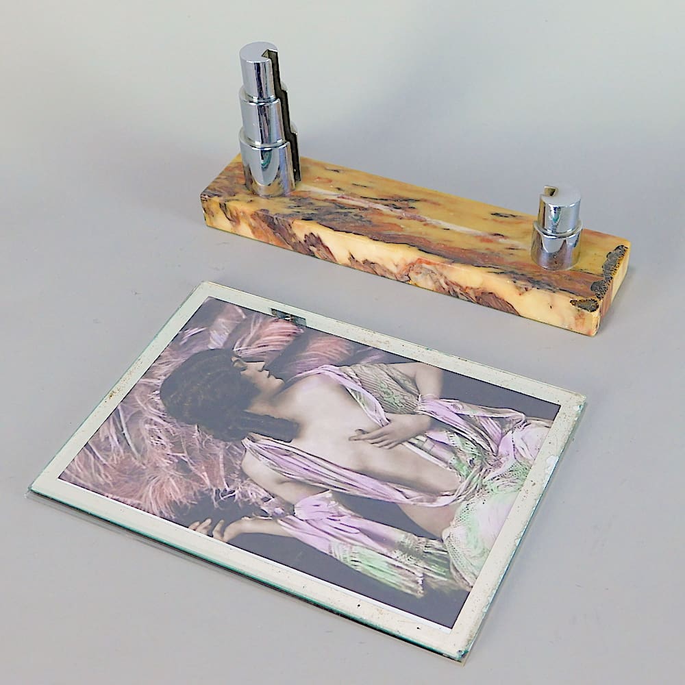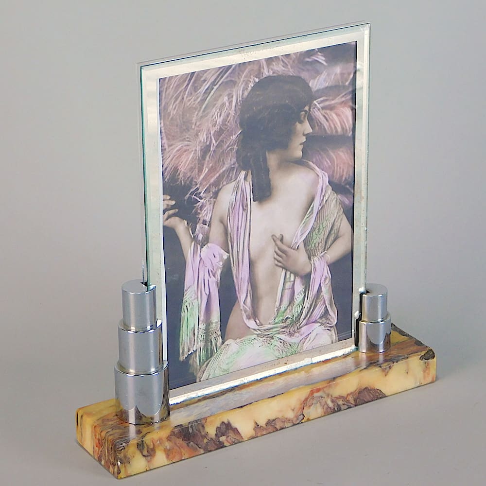 French art deco marble picture frame with chrome odillon stepped detail.