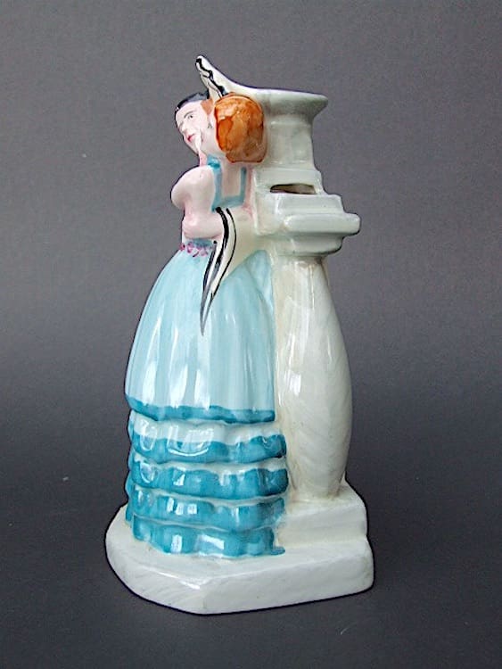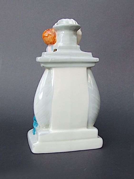 English ceramic vase by the Myott company, marked Myott and sons to the base. Beautifully hand painted pierrot and columbine standing in front of a pillar vase.