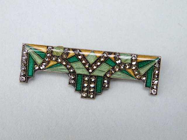 Large odillon art deco brooch with enamel and diamonte patterning. Fitted with a French slide safety clasp.