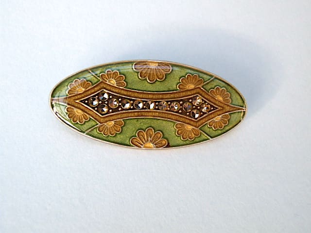 Large art deco brooch with enamel and diamonte patterning. Fitted with a French slide safety clasp.