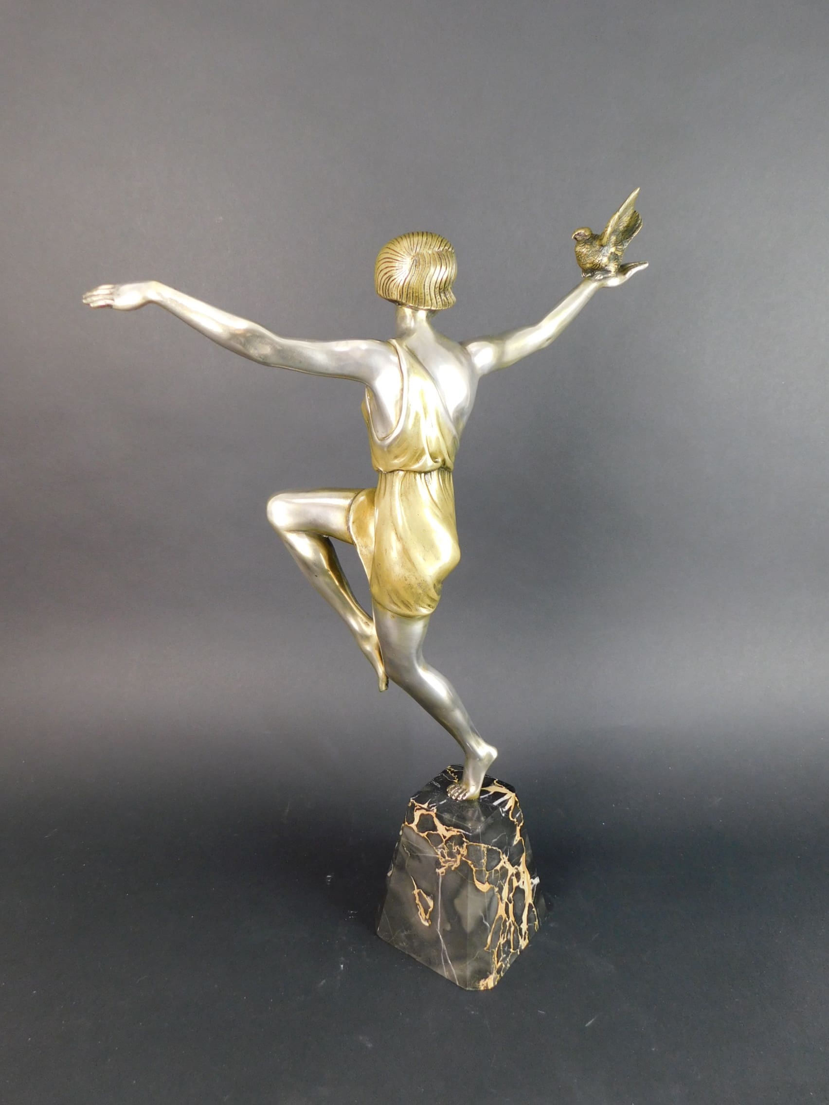 Large French silvered and gilt bronze art deco dancer. Apparently unsigned but by Pierre Le Faguays.